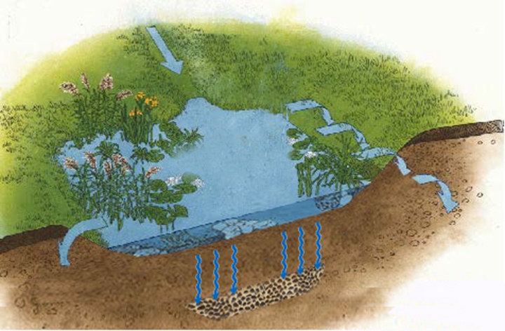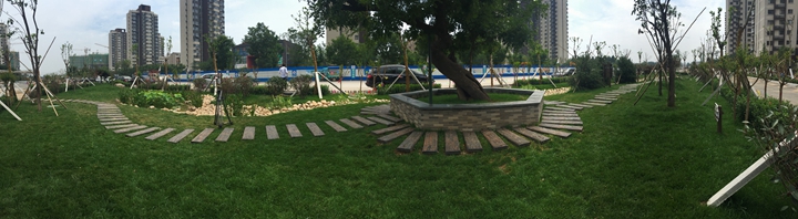主要通过建设旱溪,滞留塘,PP蓄水模块,透水铺装等低影响开发的设施,并将雨水调蓄设施与景观相结合,给游人打造开放式的景观游园。滞留塘深度约0.4m,并设置溢流井,超量雨水通过溢流井进入雨水管道。