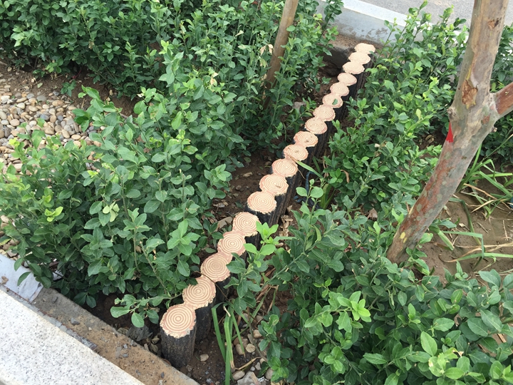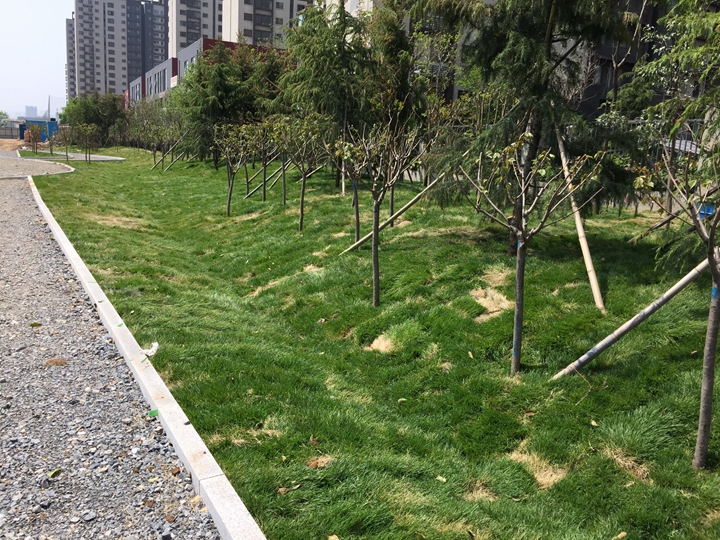 在沿园路及铺砌路面附近设置低于周边铺砌地面或道路在200 mm 以内的绿地。根据植物耐淹性及土壤的渗透性能,下凹深度在200mm左右。并结合实际情况设置适量的雨水口以保证暴雨时径流的溢流排放。