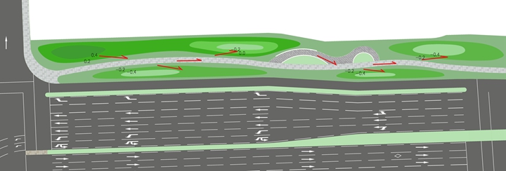 凤凰路外侧将人行道纳入到绿地当中,给行人以良好的林荫环境,绿带外侧绿带结合园路和场地进行地形处理,外侧多设置下凹式绿地和植草沟,收集地表雨水径流,增加雨水下渗,部分路口节点绿地高于节点和道路,以丰富地形以形成良好的视线关系。