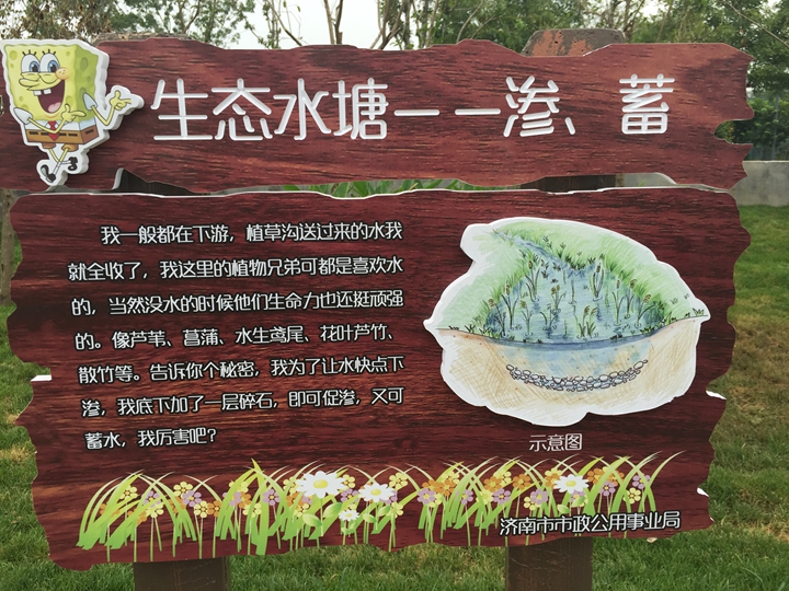 是济南首条“海绵主题路”。道路共有三大绿地系统,透水人行道、植草沟、生态水塘、齿状沿石、溢流井、下沉式绿化带、PP蓄水模块和旱溪八种不同的部分构成了完整的海绵系统,分别起到渗、蓄、净、排等作用。
