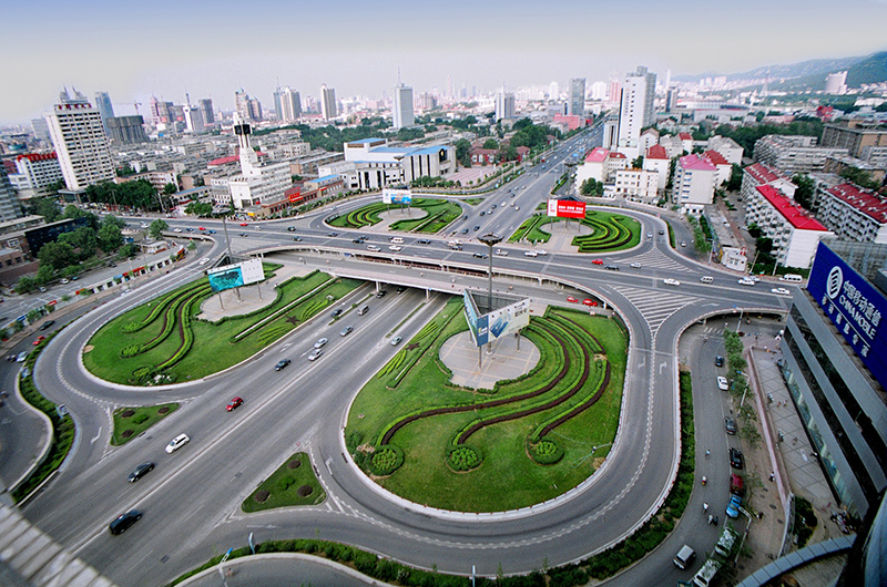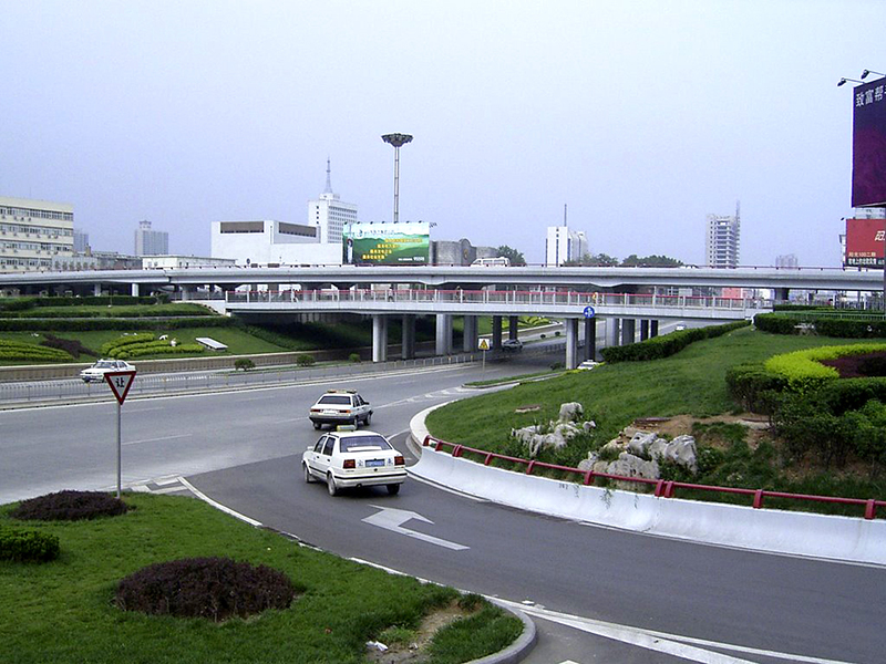 为苜蓿叶形三层互通式立交,两条主干路均宽 50 米,桥梁上部采用简支箱梁,宽腹 T 梁及三孔连续板结构,预制安装,施工简单;下部盖梁为暗藏式,墩身采用蝙蝠式柱,外形美观;基础为钢筋砼扩大基础及灌注桩;该立交充分利用原有排水系统,雨污水完全自流,经济合理。荣获市长金杯奖,被评为泉城十大景观之首。